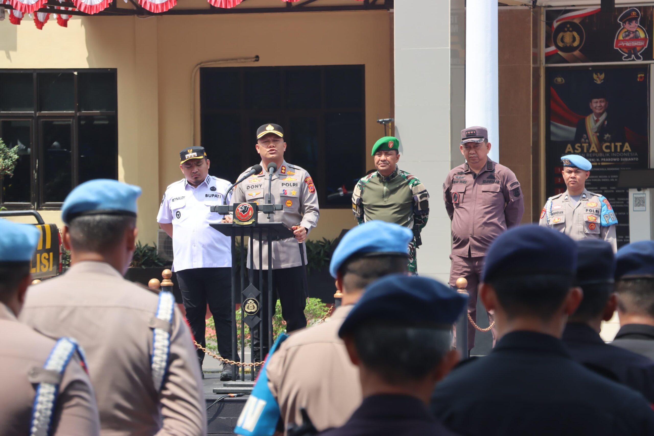 Apel gabungan tersebut dipimpin langsung oleh Kapolres Subang, AKBP Dony Eko Wicaksono, S.H., S.I.K., M.H., Ph.D., serta dihadiri oleh unsur Forkopimda Kabupaten Subang, antara lain Bupati Subang Reynaldy Putra Andita Budi Raemi, S.I.P., Dandim 0605/Subang Letkol CZI Asep Saepudin, S.E., Kajari Subang Dr. Bambang Winarno, S.H., M.H., serta perwakilan Lanud Suryadarma, Satpol PP, BPBD, dan jajaran instansi terkait lainnya.