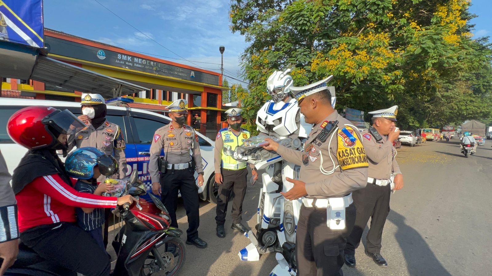 Untuk masalah ini, salah satu tokoh film kartun Robocop digandeng oleh Kasatlantas Polres saat melakukan edukasi kepada pengendara dan pelajar.